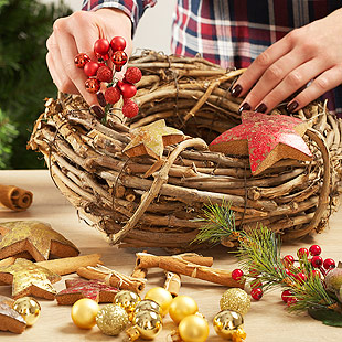 Selbst gemachte Gestecke, Türkränze und kleine Geschenke schauen hübsch aus und sind besonders individuell. Mit HEITMANN DECO setzen Sie Ihre kreativen Ideen ganz einfach um. Mit Kränzen, Steckmasse, Draht, Moos und Heißklebepistole fertigen Sie die Grundlage. Zum Verzieren eignen sich Sterne, Herzen, Schneeflocken und weitere Streuartikel aus edlen Naturmaterialien mit farbigen Akzenten. Stecker mit Floristik oder Figuren setzen Akzente, Spiegelbeeren fangen den Kerzenschein ein. Für das Basteln mit Kindern sind die Artikel mit Selbstklebepunkt ideal.